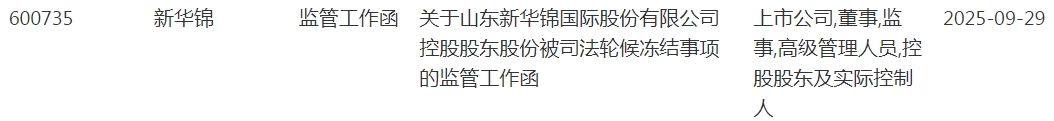 9月29日,上交所官网显示,因涉及公司控股股东股份被司法轮候冻结事项,ST新华锦(600735)收到监管工作函。
