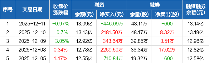辽宁成大:融资净偿还446.09万元,融资余额13.09亿元(12-11)
