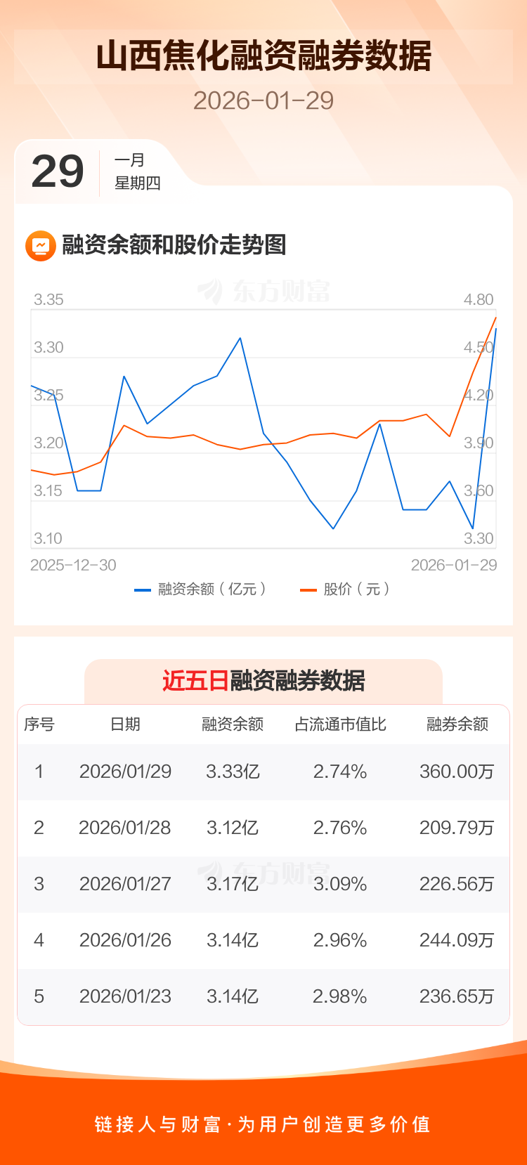 交易所最新数据显示,山西焦化于2026年1月29日获融资买入9425.25万元,融资偿还7272.61万元,当日融资净买入2152.65万元。目前,该股融资余额3.33亿,占流通市值比例为2.74%。