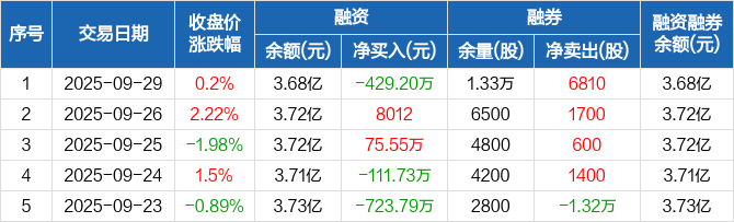 富维股份:融资净偿还429.2万元,融资余额3.68亿元(09-29)