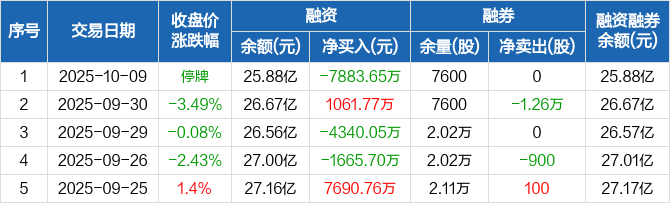 融资方面,当日融资买入0元,融资偿还7883.65万元,融资净偿还7883.65万元,净偿还额两市排名第20。融券方面,融券卖出0股,融券偿还0股,融券余量7600股,融券余额35.32万元。融资融券余额合计25.88亿元。