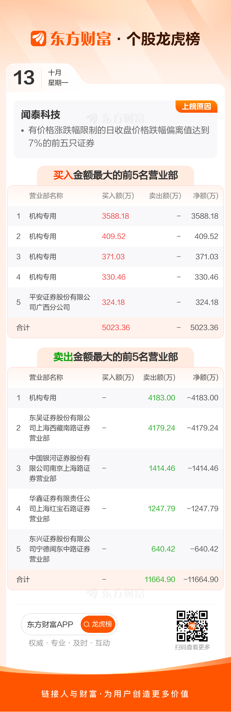 交易所2025年10月13日公布的交易公开信息显示,闻泰科技因成为有价格涨跌幅限制的日收盘价格跌幅偏离值达到7%的前五只证券上榜。闻泰科技当日收报41.83元,涨跌幅-10.00%,偏离值-9.81%,换手率0.33%,成交额1.71亿。