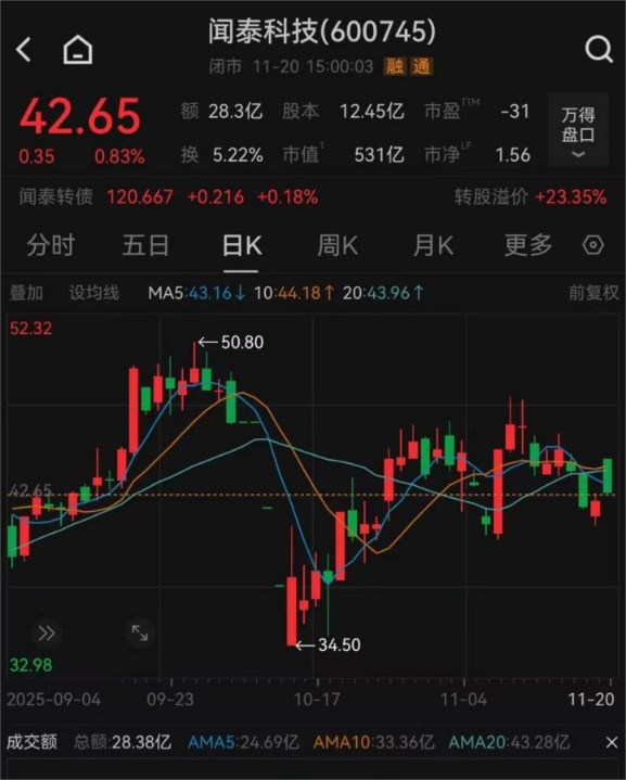 截至11月20日收盘,闻泰科技报42.65元/股,总市值为531亿元。