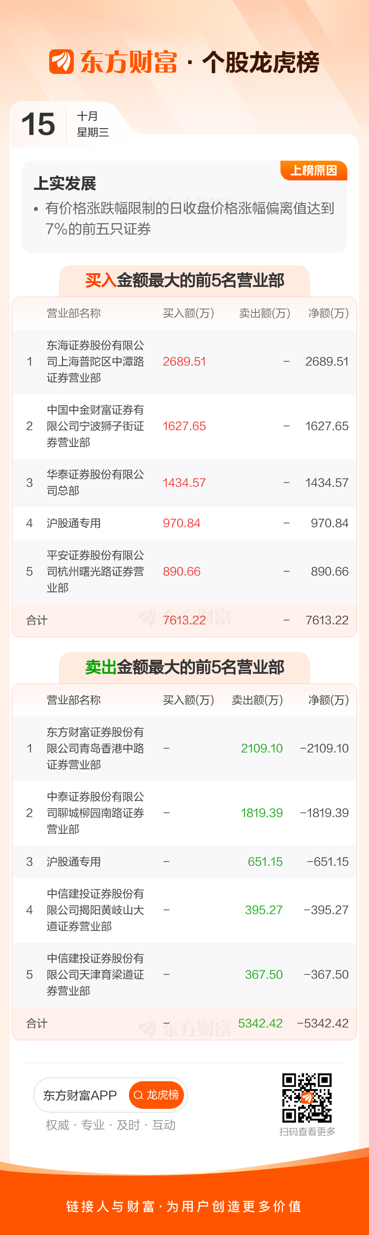 交易所2025年10月15日公布的交易公开信息显示,上实发展因成为有价格涨跌幅限制的日收盘价格涨幅偏离值达到7%的前五只证券上榜。上实发展当日收报5.25元,涨跌幅10.06%,偏离值8.85%,换手率2.22%,成交额2.14亿。