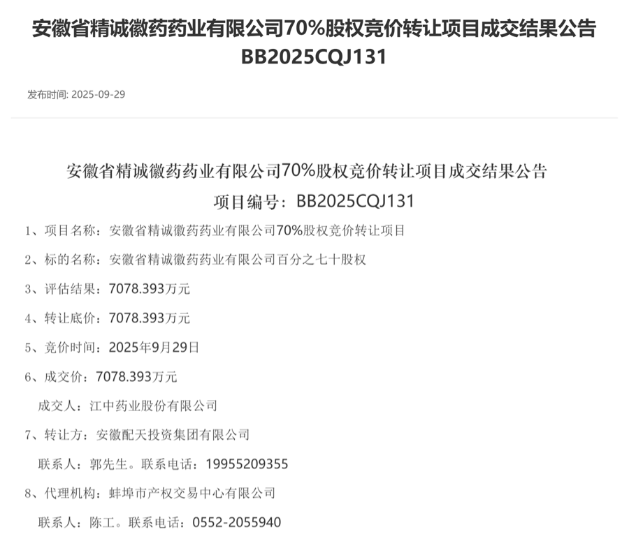 2024年10月,蚌埠市国资委下属的蚌埠投资集团取得安徽配天投资集团100% 股权;2025年8月6日,经系列投资人变更后,安徽配天投资集团成为精诚徽药唯一股东。