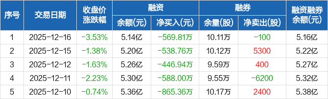 融资方面,当日融资买入2970.19万元,融资偿还3540万元,融资净偿还569.81万元,连续6日净偿还累计4692.23万元。融券方面,融券卖出0股,融券偿还100股,融券余量10.11万股,融券余额174.09万元。融资融券余额合计5.16亿元。