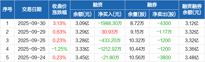 中国海防:融资净偿还1988.3万元,融资余额3.09亿元(09-30)