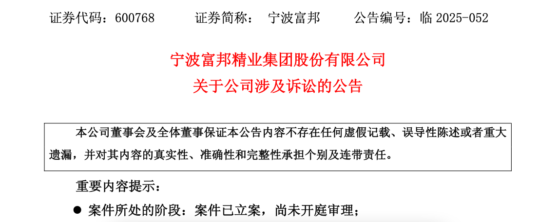 宁波富邦在公告中表示,本案尚未开庭审理,暂无法准确判断对公司本期利润或期后利润的影响。