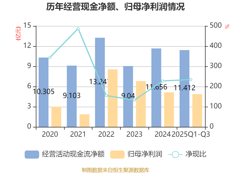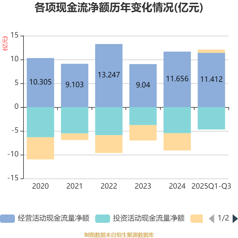 2025年前三季度,公司经营活动现金流净额为11.41亿元,同比增长16.37%;筹资活动现金流净额6658.38万元,同比增加4亿元;投资活动现金流净额-4.7亿元,上年同期为-4.38亿元。