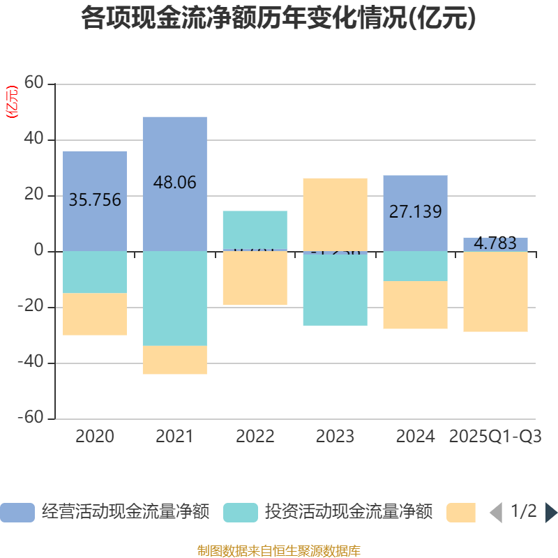 2025年前三季度,公司经营活动现金流净额为4.78亿元,同比下降54.37%;筹资活动现金流净额-28.65亿元,同比减少19.99亿元;投资活动现金流净额-2453.09万元,上年同期为-8.78亿元。