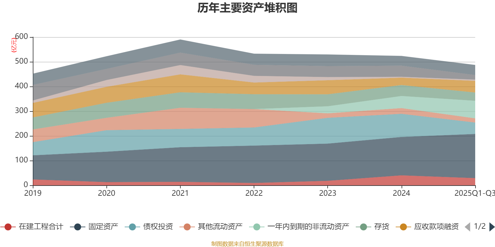 资产重大变化方面,截至2025年三季度末,公司债权投资较上年末减少50.55%,占公司总资产比重下降8.36个百分点;固定资产较上年末增加15.13%,占公司总资产比重上升7.05个百分点;一年内到期的非流动资产较上年末增加45.21%,占公司总资产比重上升5.27个百分点;货币资金较上年末减少58.58%,占公司总资产比重下降4.8个百分点。