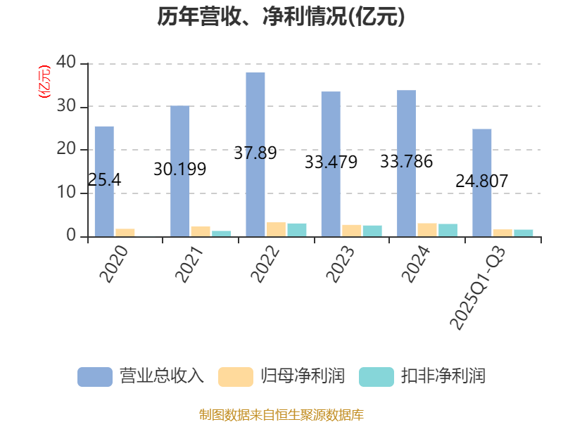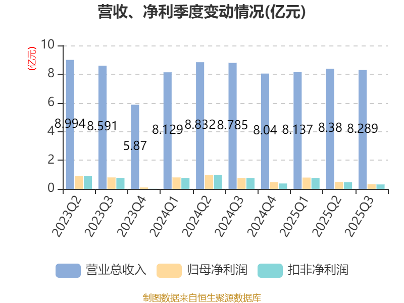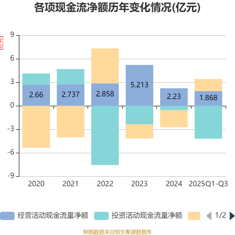2025年前三季度,公司经营活动现金流净额为1.87亿元,同比增长68.67%;筹资活动现金流净额1.55亿元,同比增加3.55亿元;投资活动现金流净额-4.21亿元,上年同期为5702.41万元。