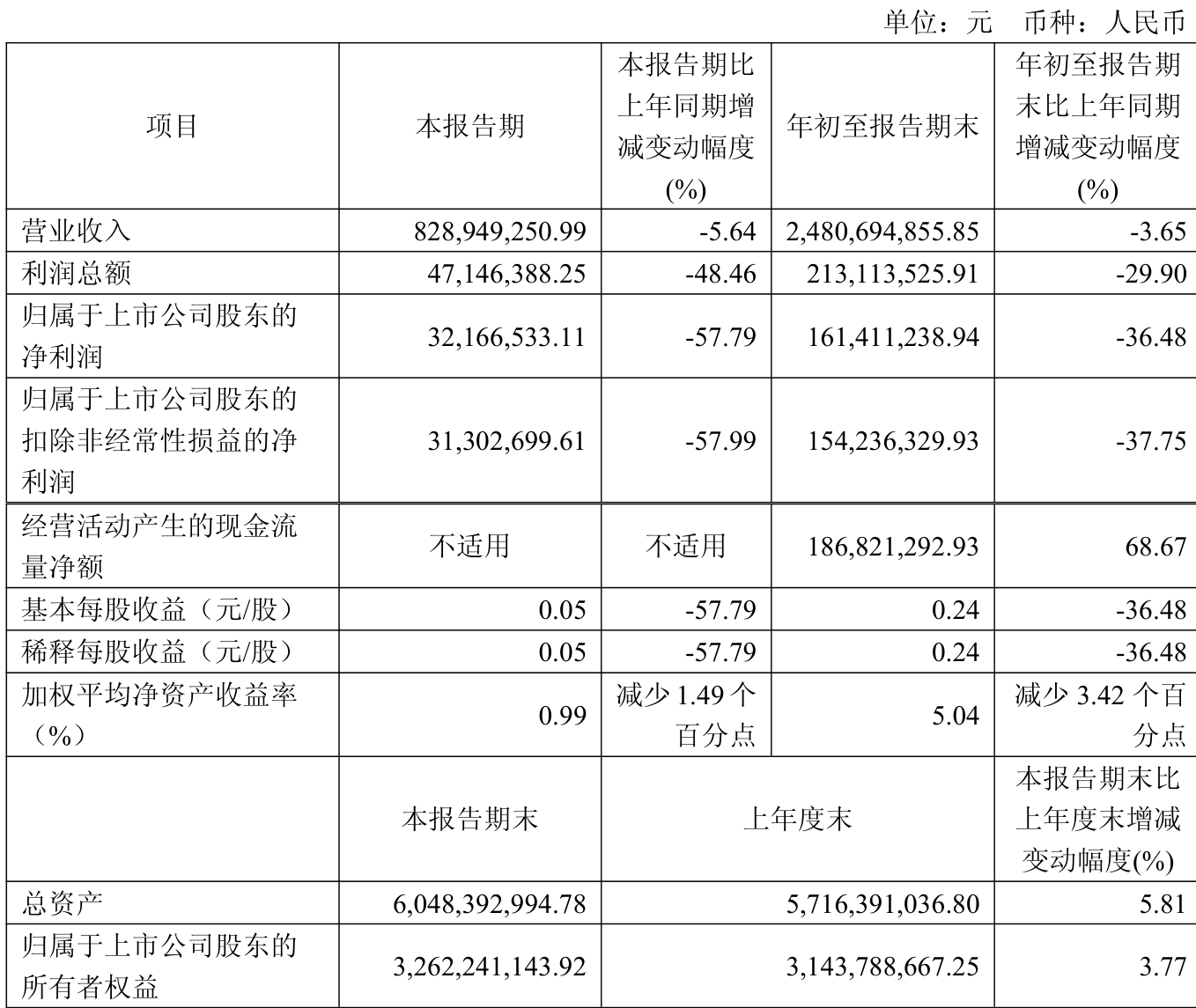 中证智能财讯鲁银投资(600784)10月30日披露2025年第三季度报告。前三季度公司实现营业总收入24.81亿元,同比下降3.65%;归母净利润1.61亿元,同比下降36.48%;扣非净利润1.54亿元,同比下降37.75%;经营活动产生的现金流量净额为1.87亿元,同比增长68.67%;报告期内,鲁银投资基本每股收益为0.24元,加权平均净资产收益率为5.04%。