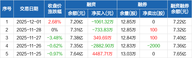融资方面,当日融资买入9228.36万元,融资偿还1.03亿元,融资净偿还1061.32万元。融券方面,融券卖出100股,融券偿还100股,融券余量12.85万股,融券余额142.76万元。融资融券余额合计7.22亿元。