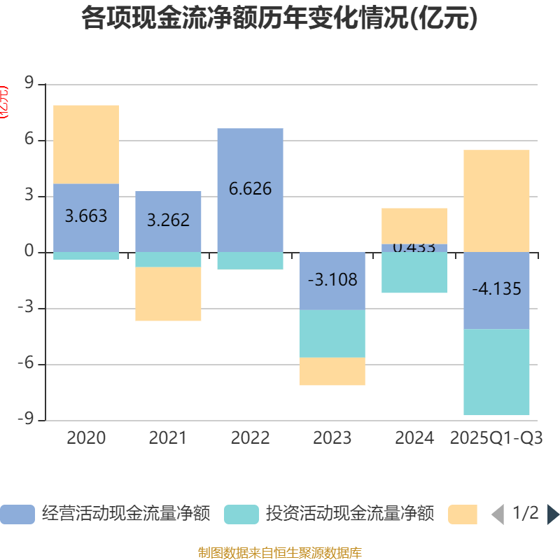 2025年前三季度,公司经营活动现金流净额为-4.13亿元,同比减少2.42亿元;筹资活动现金流净额5.47亿元,同比增加4.1亿元;投资活动现金流净额-4.6亿元,上年同期为-4968.11万元。