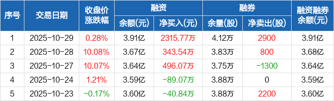 融资方面,当日融资买入7493.34万元,融资偿还5177.57万元,融资净买入2315.77万元,连续3日净买入累计3155.37万元。融券方面,融券卖出2900股,融券偿还0股,融券余量4.12万股,融券余额29.33万元。融资融券余额合计3.91亿元。