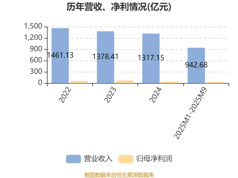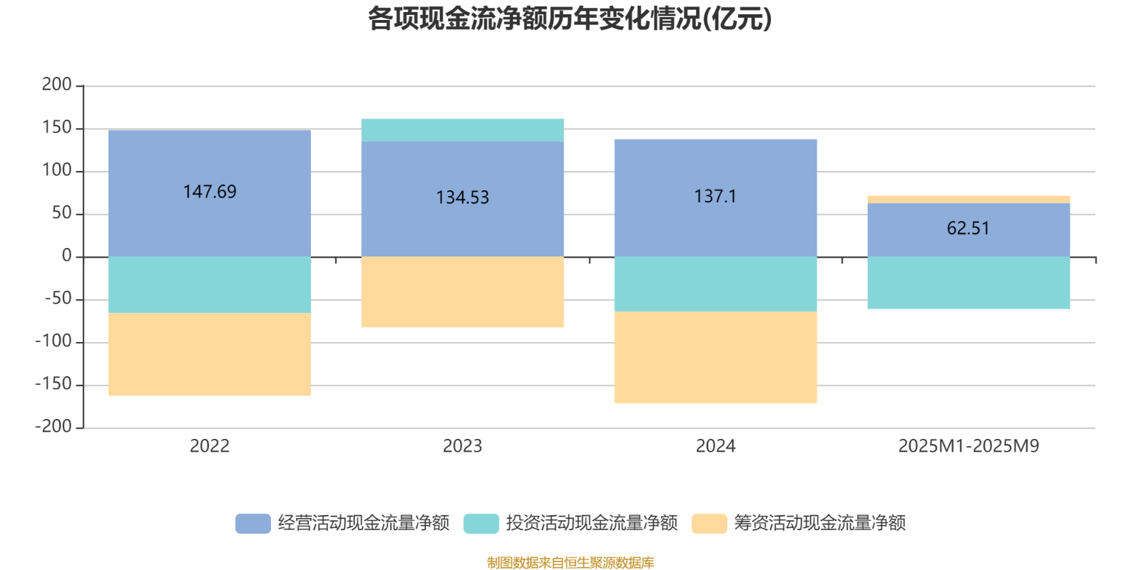 2025年1月至9月,公司经营活动现金流净额为62.51亿元,同比下降7.88%;筹资活动现金流净额8.6亿元,同比增加42.02亿元;投资活动现金流净额-61.32亿元,上年同期为-72.45亿元。