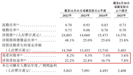 尽管报告期内保持着千亿元规模的营收和百亿元级别的溢利,但公司的资本回报效率却正在下滑。例如,报告期内,新奥股份净资产收益率(ROE)从2023年的22.8%降至了2024年的16.7%,同期,资产回报率(ROA)从9.3%下降至了7.4%。