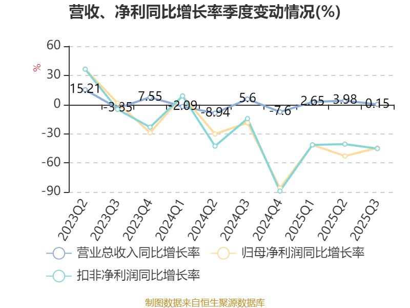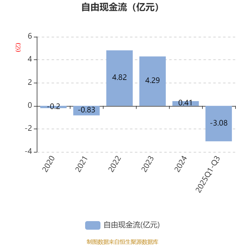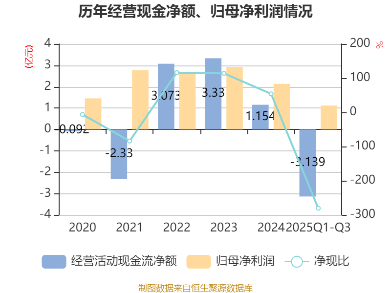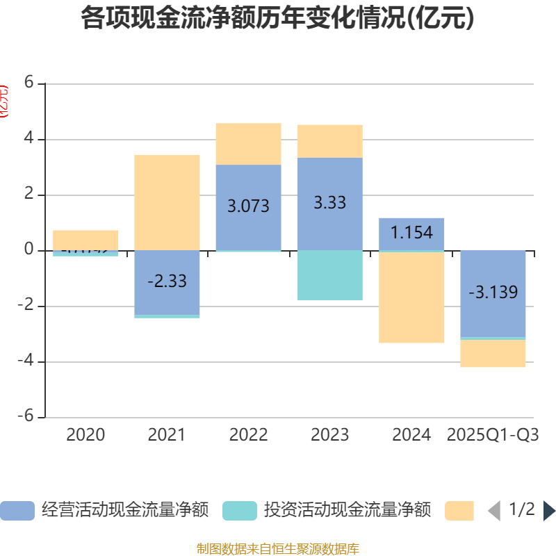 2025年前三季度,公司经营活动现金流净额为-3.14亿元,同比减少7064.34万元;筹资活动现金流净额-9817.72万元,同比增加1.57亿元;投资活动现金流净额-877.64万元,上年同期为-416.07万元。