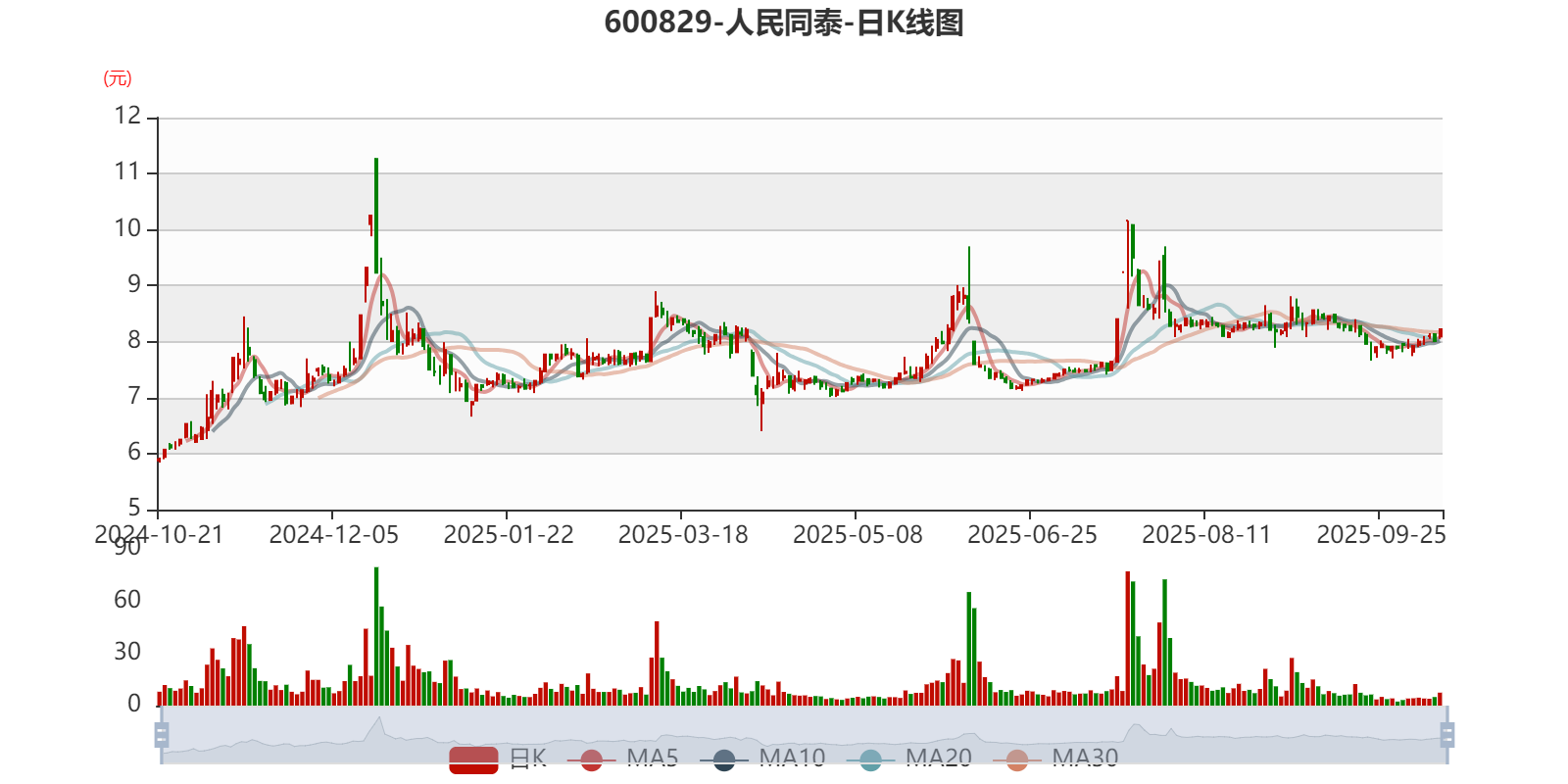 中证智能财讯人民同泰(600829)10月21日披露2025年第三季度报告。前三季度公司实现营业总收入78.46亿元,同比增长2.19%;归母净利润1.12亿元,同比下降45.69%;扣非净利润1.1亿元,同比下降42.68%;经营活动产生的现金流量净额为-3.14亿元,上年同期为-2.43亿元;报告期内,人民同泰基本每股收益为0.1929元,加权平均净资产收益率为3.81%。