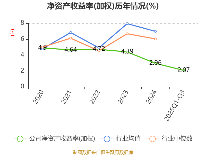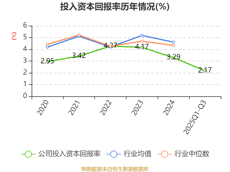 盈利能力方面, 2025年前三季度公司加权平均净资产收益率为2.07%,同比下降0.98个百分点。公司2025年前三季度投入资本回报率为2.17%,较上年同期下降0.64个百分点。