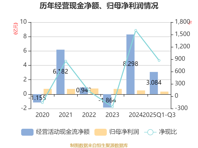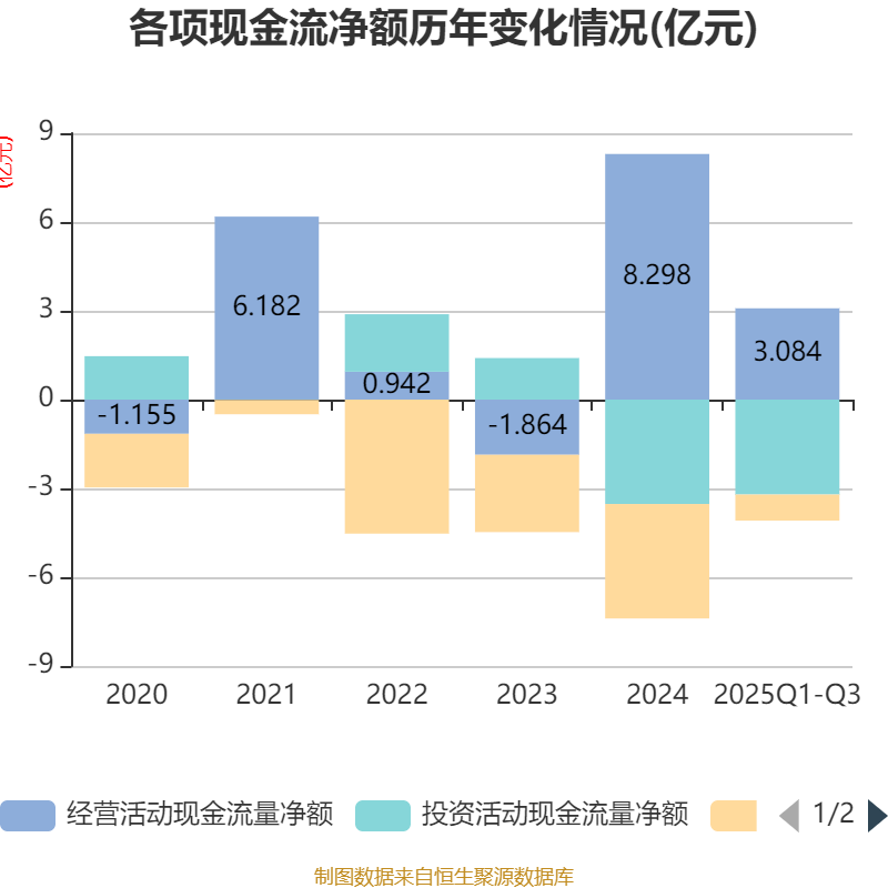 2025年前三季度,公司经营活动现金流净额为3.08亿元,同比下降14.95%;筹资活动现金流净额-8804.15万元,同比增加4377.27万元;投资活动现金流净额-3.21亿元,上年同期为-2.32亿元。