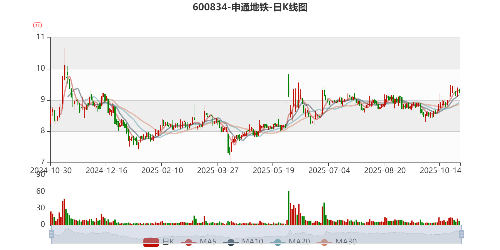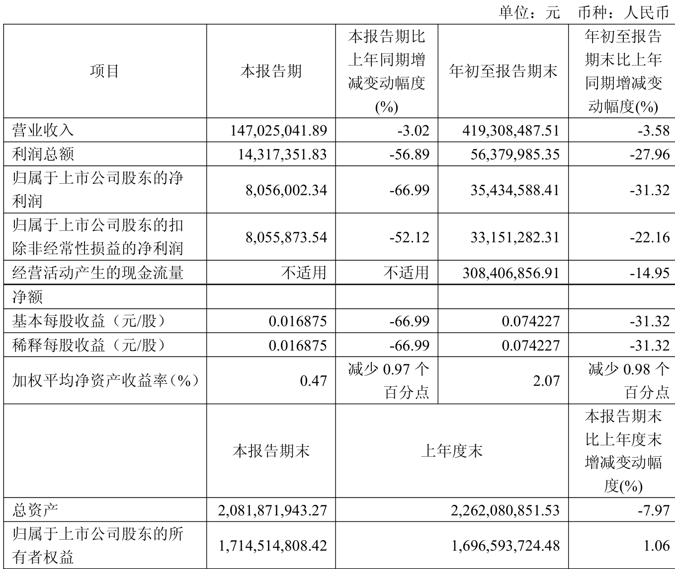 中证智能财讯申通地铁(600834)10月30日披露2025年第三季度报告。前三季度公司实现营业总收入4.19亿元,同比下降3.58%;归母净利润3543.46万元,同比下降31.32%;扣非净利润3315.13万元,同比下降22.16%;经营活动产生的现金流量净额为3.08亿元,同比下降14.95%;报告期内,申通地铁基本每股收益为0.0742元,加权平均净资产收益率为2.07%。
