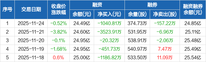 融资方面,当日融资买入5280.79万元,融资偿还6321.6万元,融资净偿还1040.81万元,连续5日净偿还累计6223.6万元。融券方面,融券卖出9.22万股,融券偿还166.44万股,融券余量374.73万股,融券余额3563.68万元。融资融券余额合计24.85亿元。