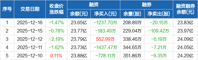 四川长虹:融资净偿还1237.7万元,融资余额23.65亿元(12-16)
