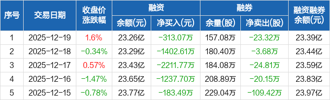 融资方面,当日融资买入4145.56万元,融资偿还4458.63万元,融资净偿还313.07万元,连续5日净偿还累计5348.64万元。融券方面,融券卖出6100股,融券偿还23.93万股,融券余量157.08万股,融券余额1394.87万元。融资融券余额合计23.39亿元。