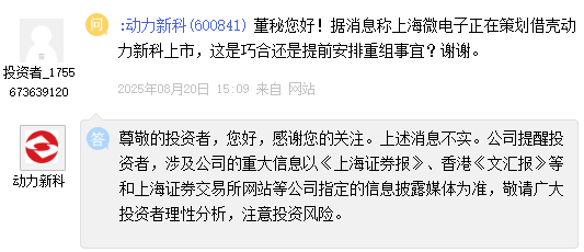 9月9日,针对有投资者提问动力新科,据消息称上海微电子正在策划借壳动力新科上市,这是巧合还是提前安排重组事宜?动力新科在互动平台表示,上述消息不实。