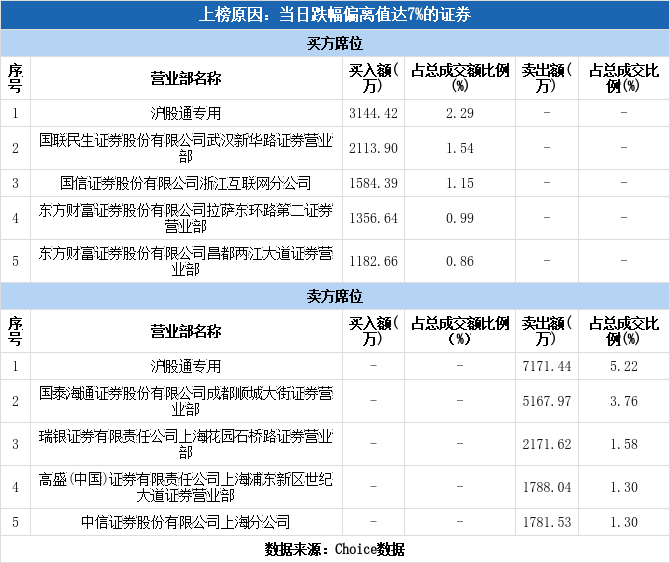 沪股通现身龙虎榜,航天长峰跌停(12-17)