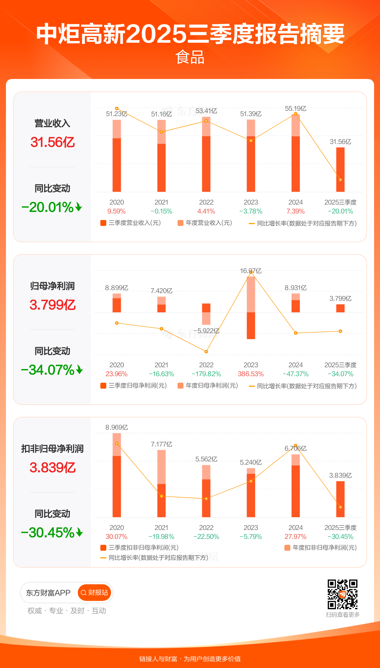中炬高新10月25日发布2025年三季报显示,公司前三季实现营业收入31.56亿元,同比下滑20.01%;归母净利润3.80亿元,同比下滑34.07%;扣非归母净利润3.84亿元,同比下滑30.45%。