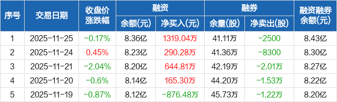 融资方面,当日融资买入2297.83万元,融资偿还978.79万元,融资净买入1319.04万元,连续4日净买入累计2419.43万元。融券方面,融券卖出900股,融券偿还3400股,融券余量41.11万股,融券余额732.96万元。融资融券余额合计8.43亿元。