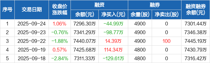 凯盛新能:融资净偿还44.99万元,融资余额7296.3万元(09-24)