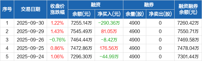 凯盛新能:融资净偿还290.36万元,融资余额7255.14万元(09-30)