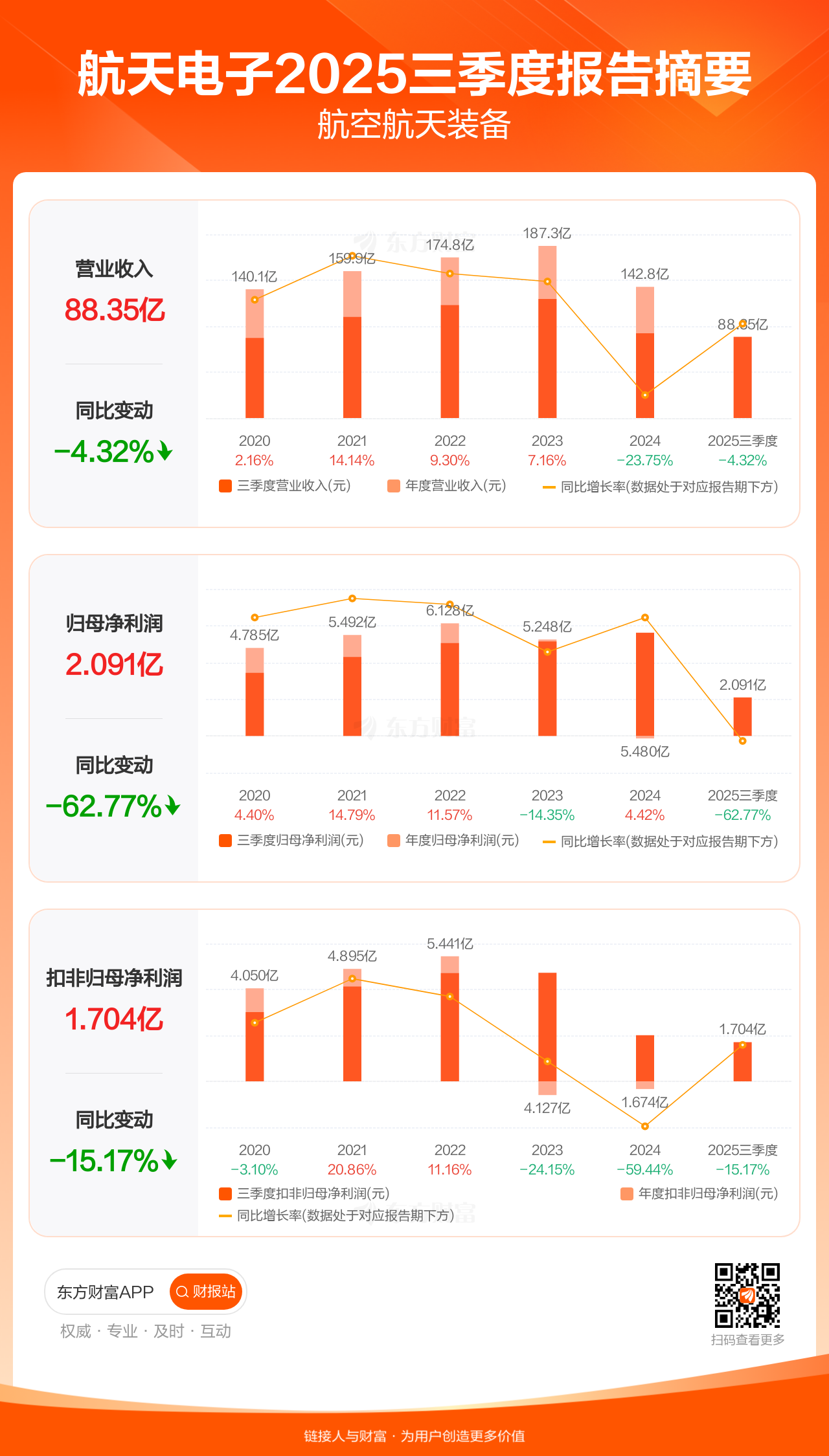航天电子10月30日发布2025年三季报显示,公司前三季实现营业收入88.35亿元,同比下滑4.32%;归母净利润2.09亿元,同比下滑62.77%;扣非归母净利润1.70亿元,同比下滑15.17%。