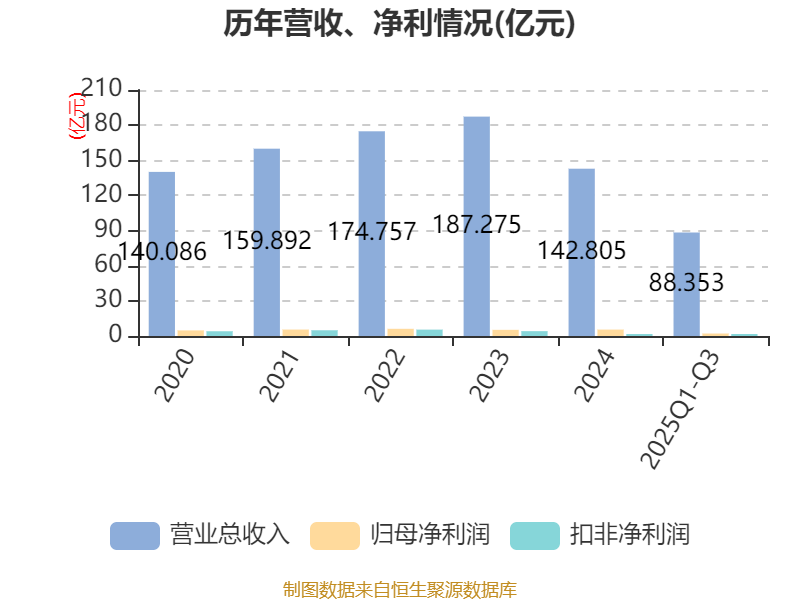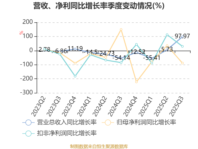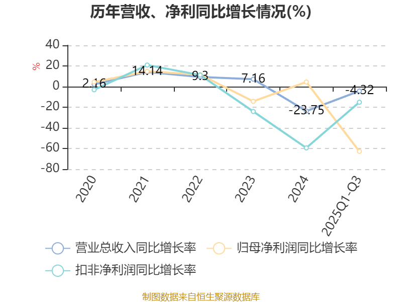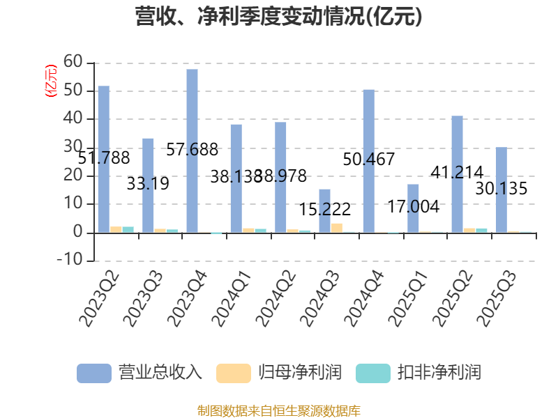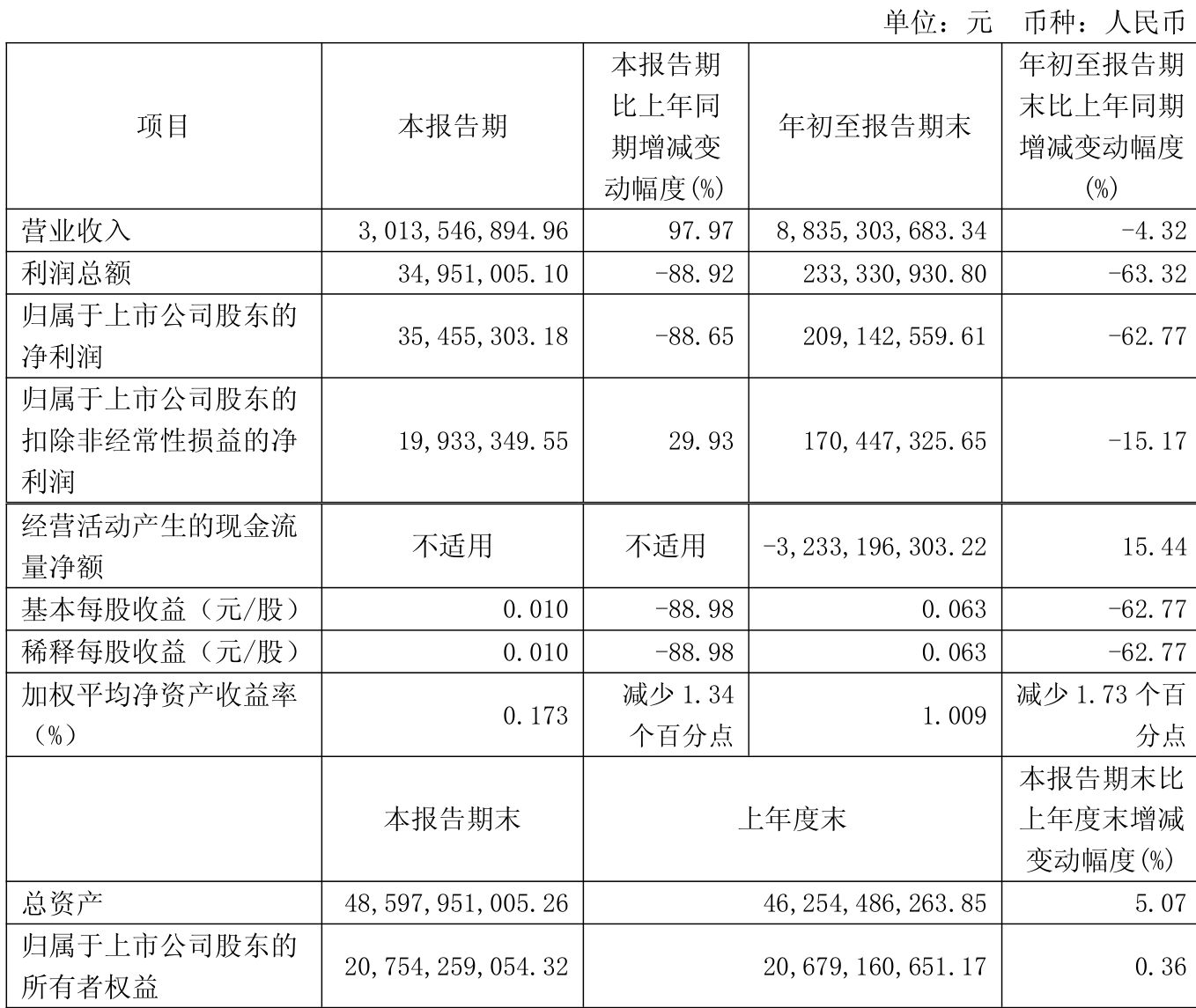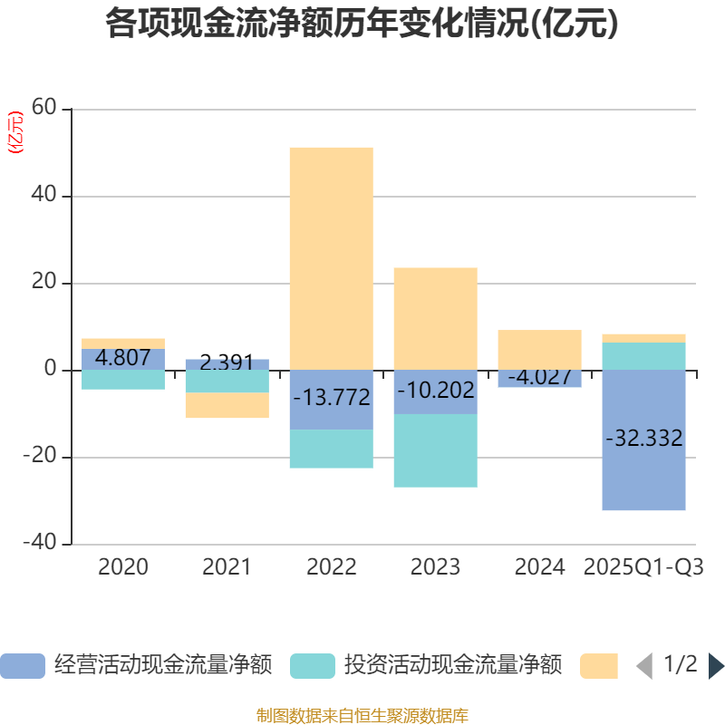 2025年前三季度,公司经营活动现金流净额为-32.33亿元,同比增加5.9亿元;筹资活动现金流净额1.93亿元,同比减少15.71亿元;投资活动现金流净额6.25亿元,上年同期为2.01亿元。