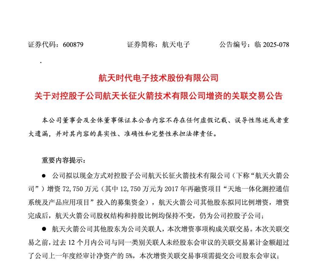 航天电子(600879)增资旗下公司7.28亿元,加快融入商业航天新发展格局!