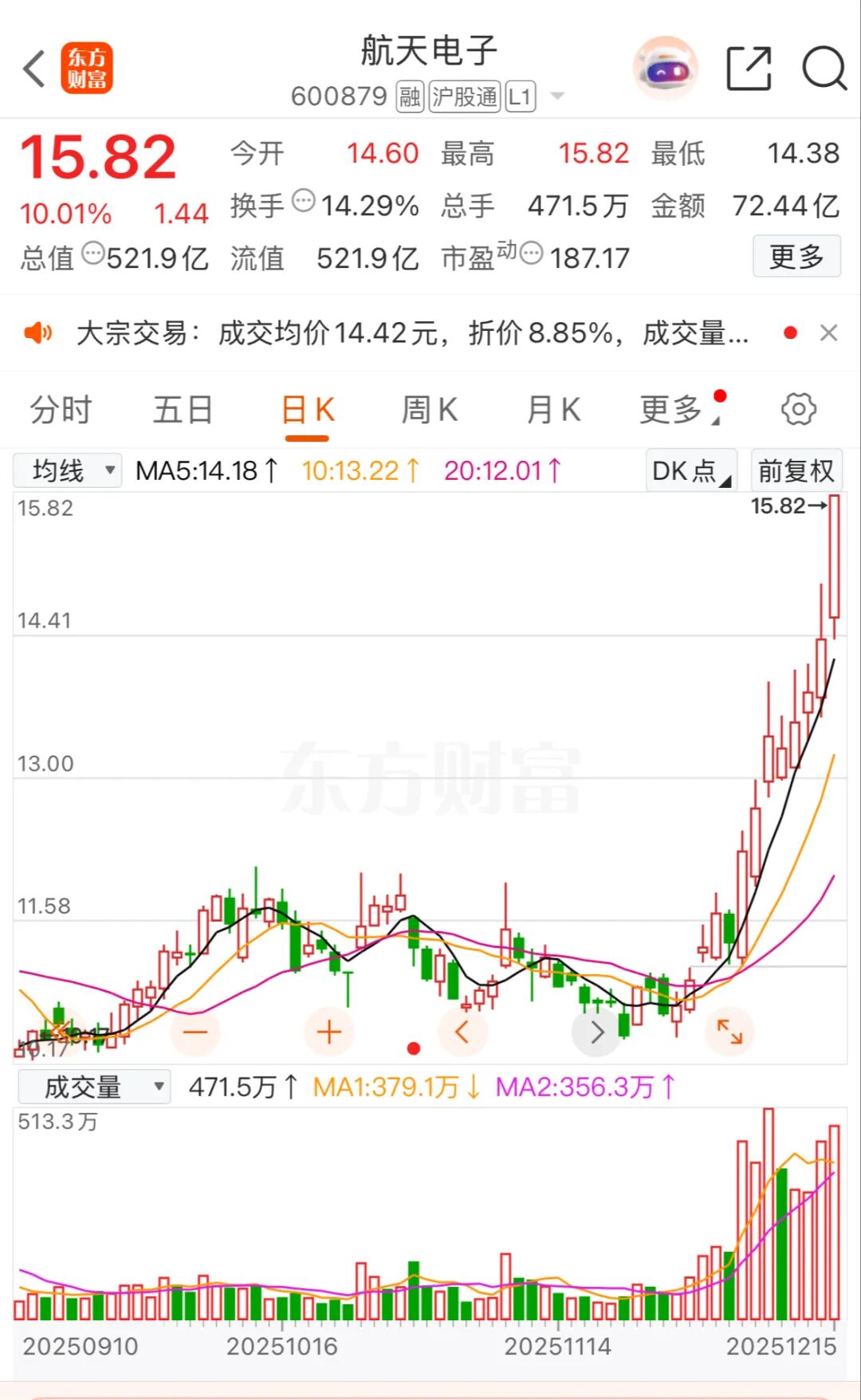 当日,航天电子以涨停收盘,报15.82元/股,股价创历史新高。12月1日至15日,航天电子上涨超44%。