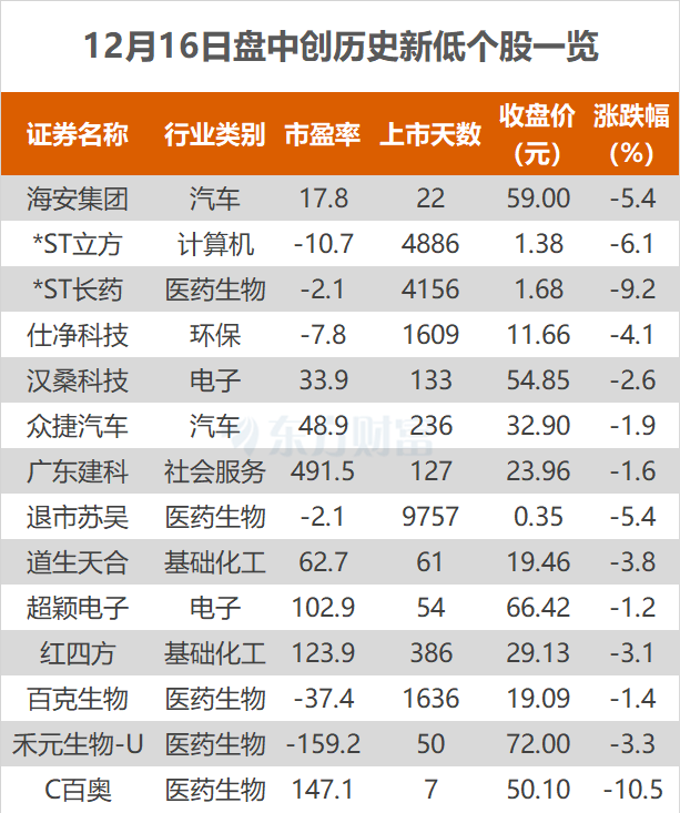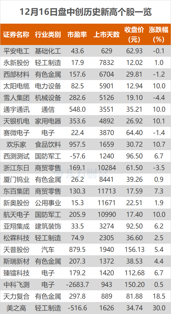 12月16日,A股三大指数今日集体回调,截止收盘,沪指跌1.11%,收报3824.81点;深证成指跌1.51%,收报12914.67点;创业板指跌2.10%,收报3071.76点。东方财富Choice数据显示,今日有23只个股盘中股价创历史新高,分别为航天电子、雪人集团等。