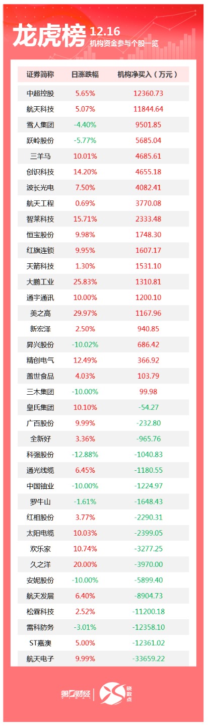龙虎榜丨机构今日买入这20股,卖出航天电子3.37亿元