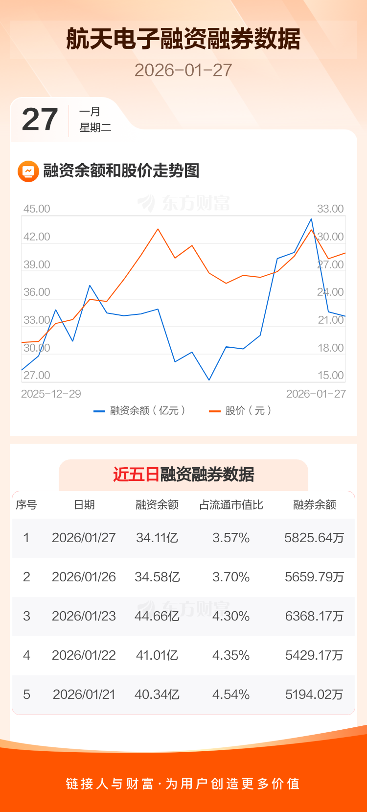 交易所最新数据显示,航天电子于2026年1月27日获融资买入8.40亿元,融资偿还8.86亿元,当日融资净偿还4647.39万元。目前,该股融资余额34.11亿,占流通市值比例为3.57%。
