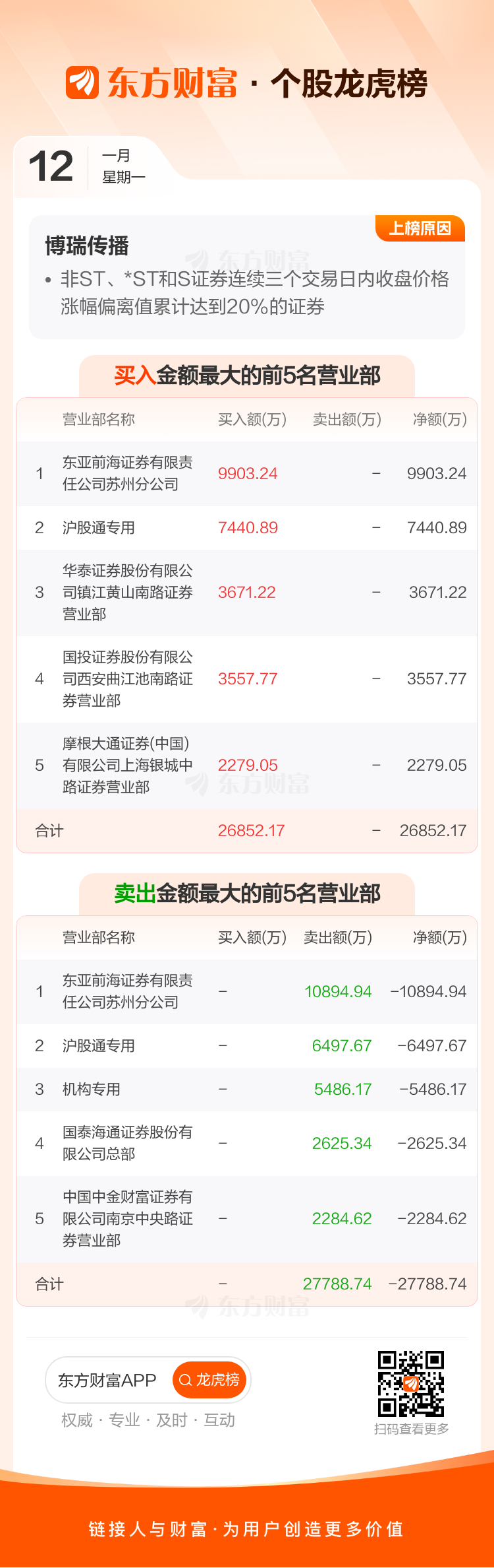 交易所2026年1月12日公布的交易公开信息显示,博瑞传播因成为非ST、*ST和S证券连续三个交易日内收盘价格涨幅偏离值累计达到20%的证券上榜。博瑞传播当日收报7.12元,涨跌幅10.05%,换手率2.83%,成交额2.20亿。异常期间1月8日至1月12日,期间涨幅22.34%,累计偏离值20.39%,区间成交额17.30亿。