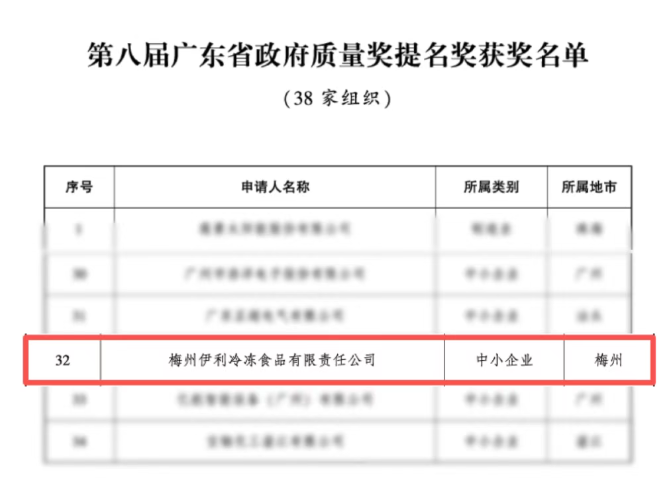 近日,第八届广东省政府质量奖评选结果正式揭晓,梅州伊利冷冻食品有限责任公司凭借卓越的质量管理模式及全产业链质量创新实践,荣获本届省政府质量奖提名奖,成为广东省首家获此殊荣的冷冻食品企业,标志着其质量管理水平的杰出与卓越。
