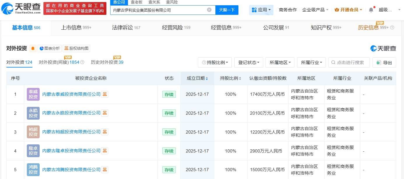 天眼查工商信息显示,近日,内蒙古永皓投资有限责任公司、内蒙古泰威投资有限责任公司、内蒙古鸿腾投资有限责任公司、内蒙古裕超投资有限责任公司、内蒙古隆卓投资有限责任公司成立,法定代表人均为乌云达来,注册资本分别为2.01亿人民币、1.74亿人民币、1.5亿人民币、1.22亿人民币、2900万人民币,经营范围为企业管理、企业管理咨询、以自有资金从事投资活动。股东信息显示,上述公司均由伊利股份(600887)全资持股。