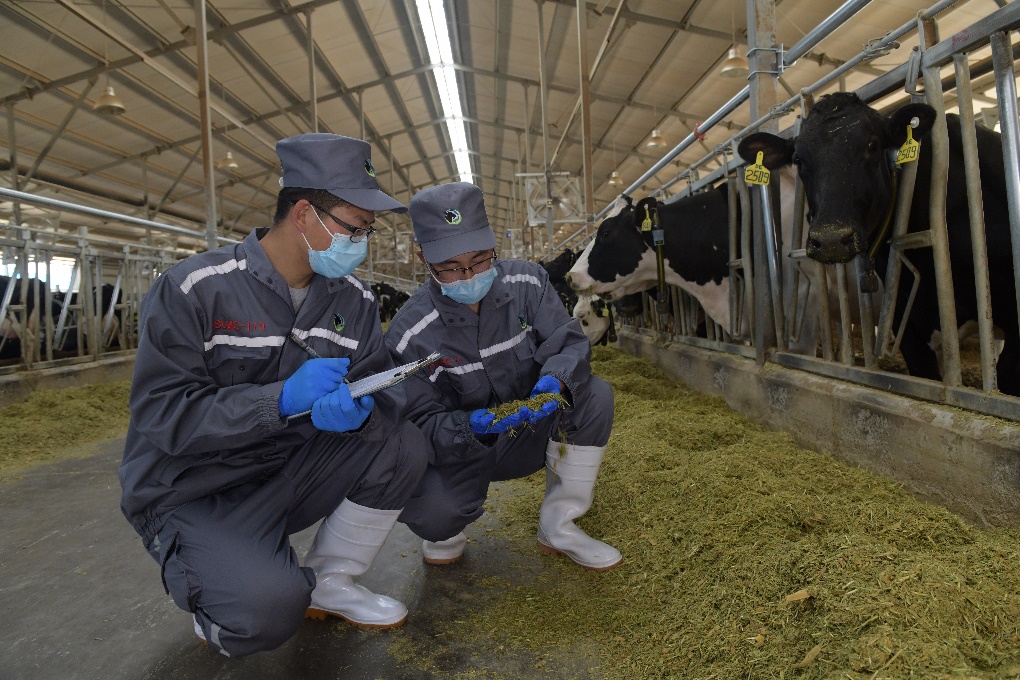 牧场工作人员研究优化奶牛日粮配方