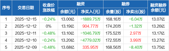 融资方面,当日融资买入3818.88万元,融资偿还5708.63万元,融资净偿还1889.75万元。融券方面,融券卖出1.08万股,融券偿还7.12万股,融券余量168.16万股,融券余额694.5万元。融资融券余额合计13.07亿元。