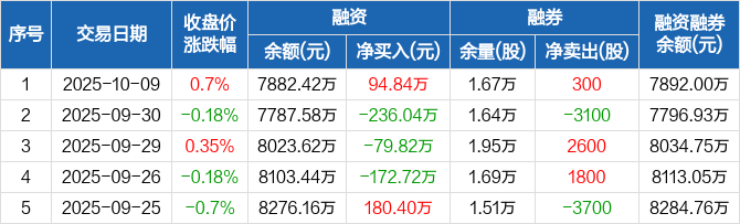 重庆燃气:融资净买入94.84万元,融资余额7882.42万元(10-09)