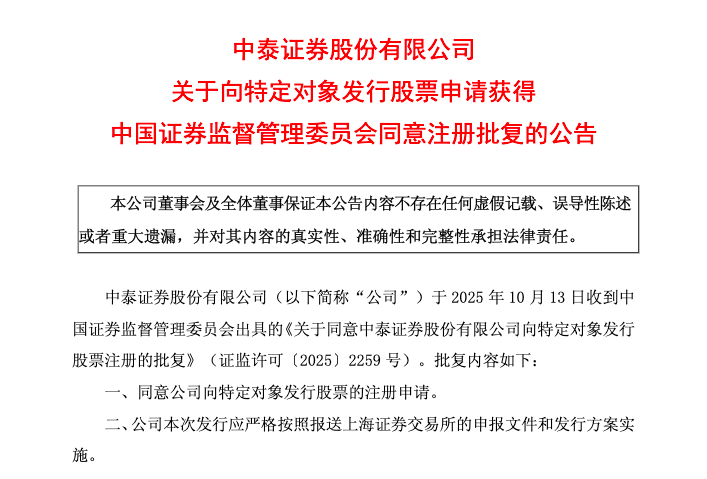 10月13日晚间,中泰证券公告称,公司于10月13日收到中国证券监督管理委员会出具的《关于同意中泰证券股份有限公司向特定对象发行股票注册的批复》。批复同意公司向特定对象发行股票,本次发行应严格按照报送上海证券交易所的申报文件和发行方案实施。
